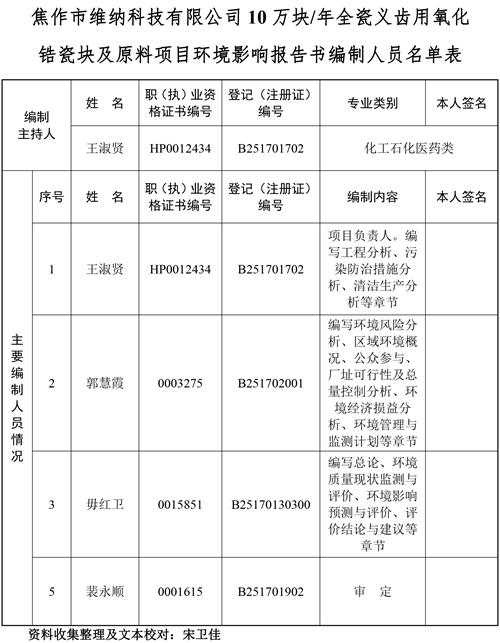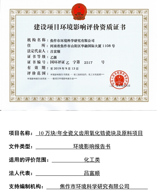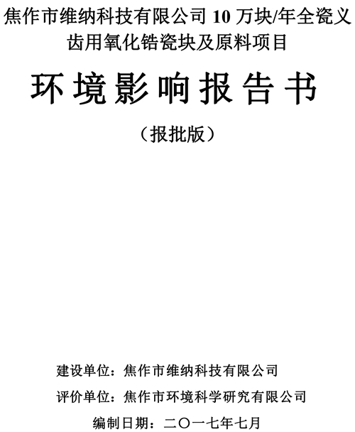 關(guān)于焦作市維納科技有限公司10萬塊/年全瓷義齒用氧化鋯瓷塊及原料項目環(huán)評報告書信息公司。