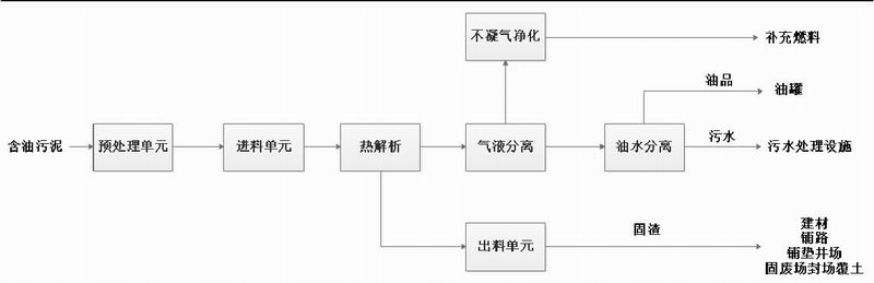工藝流程:采用熱解技術外部加熱形式,將物料加熱至300~500℃,含油污泥中的水、油品等在密閉無氧空間中蒸發(fā)析出,經(jīng)過冷凝系統(tǒng)后使揮發(fā)物凝結,在通過油水分離裝置分離出油品,油品經(jīng)過加工后出售。產(chǎn)出的不凝氣可作為補充燃料使用。